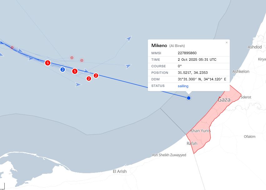 Küresel Sumud Filosu'nun 50'den fazla gemisinden biri olan Mikeno, Gazze kıyılarına ulaştı.