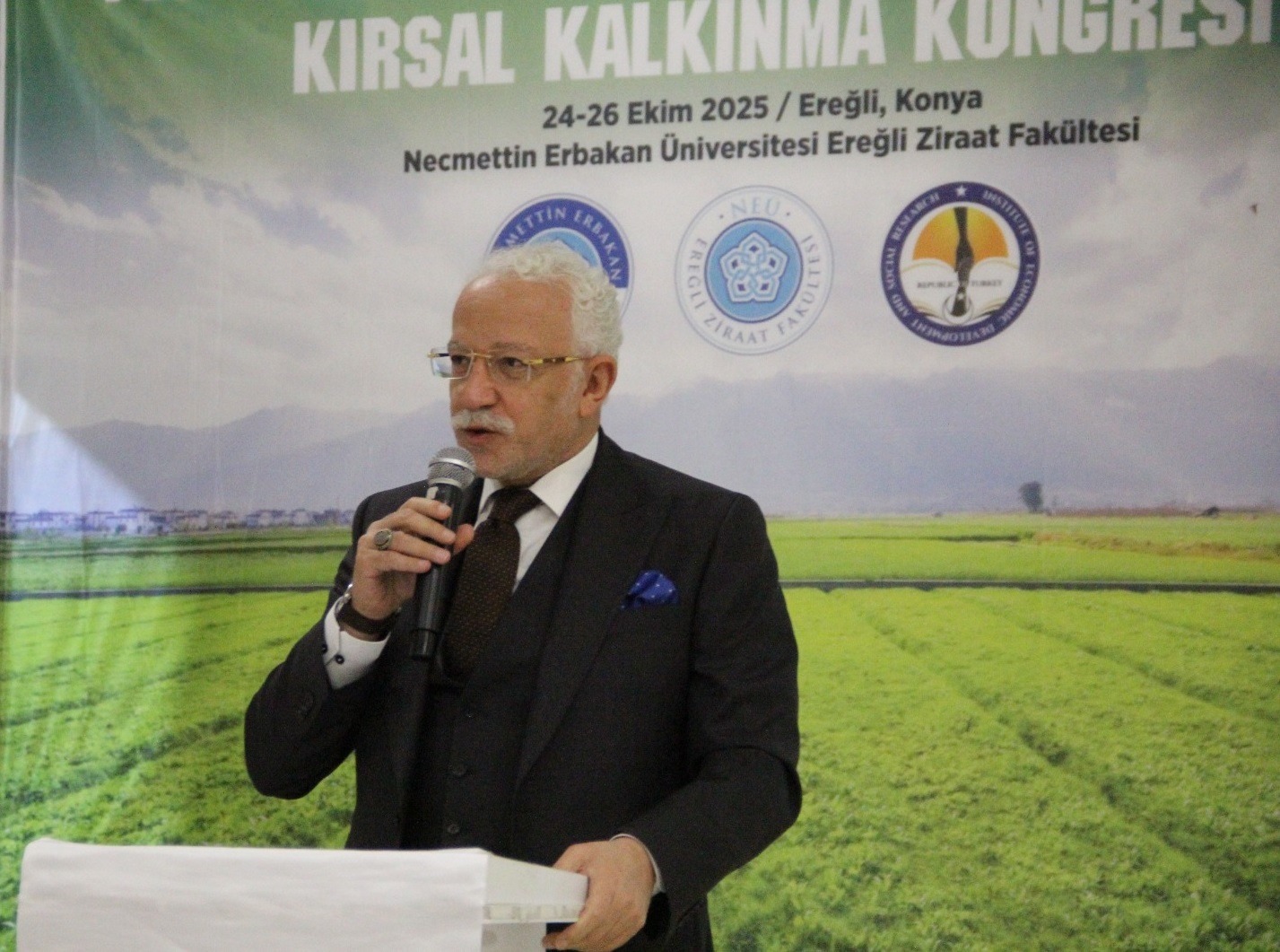 Necmettin Erbakan Üniversitesinin bilimi, emeğin ve üretimin merkezinde konumlandıran bir anlayışa sahip olduğunu aktaran Rektör Prof. Dr. Cem Zorlu, "Ereğli Ziraat Fakültemiz bu anlayışın mümbit bir örneğidir. ISPEC katkılarıyla gerçekleşen bu uluslararası buluşma, bilimin sınır tanımayan ruhunu temsil etmektedir. Kongremiz, 32 farklı ülkeden gelen 320 katılımcı ile dört kıtayı Ereğli'de buluşturuyor. Bu birliktelik, bilginin coğrafyası olmadığını, insanlığın ortak geleceğinin aynı masa etrafında konuşulabileceğini göstermektedir. Ereğli, Anadolu'nun bereket kapılarından biridir. Toprağının gücü, üretim kültürüne dönüşmüştür. Beyaz kiraz, siyah havuç, koyun yoğurdu ve uzun kabak gibi coğrafi işaretli ürünler bu toprağın hafızasını taşır. Ereğli aynı zamanda Türkiye'nin süt üretiminde ilçeler bazında ilk sıradadır. Yıllık 400 bin ton süt üretimiyle ülkemizin gıda güvenliğine büyük katkı sunar. Türkiye'de peynir ve süt üretiminin yüzde 2'sini, Konya genelinde ise yüzde 35'ini karşılar. 188 bin büyükbaş, 315 bin küçükbaş, 310 bin kümes hayvanı ve 460 yarış atı, bu üretim gücünün göstergesidir. Ereğli'de işlenen 122 bin hektardan fazla tarım arazisinin yüzde 41'i sulu, yüzde 59'u kıraçtır. İlçenin 64'ünde tarla ziraatı, yüzde 5'inde meyve, yüzde 11'inde sebze üretimi yapılır. Bu oranlar, emeğin sabırla yoğrulmuş istatistikleridir. Her bir rakamın ardında bir insan hikâyesi, bir üretim iradesi vardır” diye konuştu.