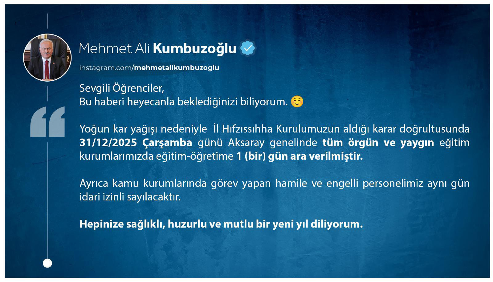 "Sevgili öğrenciler, bu haberi heyecanla beklediğinizi biliyorum. Yoğun kar yağışı nedeniyle İl Hıfzıssıhha Kurulumuzun aldığı karar doğrultusunda 31 Aralık 2025 Çarşamba günü Aksaray genelinde tüm örgün ve yaygın eğitim kurumlarımızda eğitim-öğretime 1 gün ara verilmiştir. Ayrıca kamu kurumlarında görev yapan hamile ve engelli personelimiz aynı gün idari izinli sayılacaktır. Hepinize sağlıklı, huzurlu ve mutlu bir yeni yıl diliyorum" dedi.