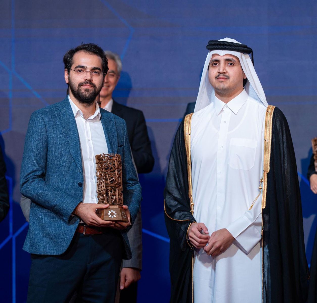 Çevirileri ile birlikte Beka Yayınları editörü olarak "Başarı Ödülü”nü kazanan NEÜ Ahmet Keleşoğlu İlahiyat Fakültesi Araştırma Görevlisi Mehmet Ali Kılınç'a ödülünü Şeyh Thani bin Hamad Al Thani takdim etti.