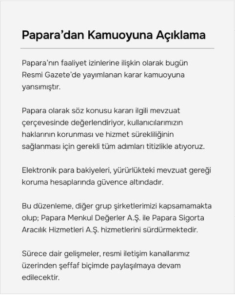 Papara'dan yapılan açıklamada dikkat çeken bir detay öne çıkıyor: Hesabında kayıtlı ve aktif IBAN bulunan kullanıcılar nakit bakiyelerini çekebilirken, kredi kartı ile yatırılan tutarların şu aşamada çekilemediği belirtildi. Şirket, bu konudaki gelişmelerin takip edilmesi gerektiğini vurguladı.