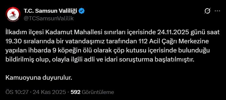 "İlkadım ilçesi Kadamut Mahallesi sınırları içerisinde 24.11.2025 günü saat 19.30 sıralarında bir vatandaşımız tarafından 112 Acil Çağrı Merkezi'ne yapılan ihbarda 9 köpeğin ölü olarak çöp kutusu içerisinde bulunduğu bildirilmiş olup, olayla ilgili adli ve idari soruşturma başlatılmıştır. Kamuoyuna duyurulur.”