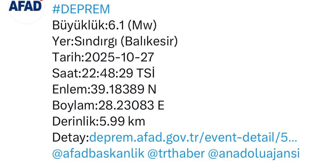 "Balıkesir Sındırgı'da 6,1 büyüklüğünde bir deprem meydana gelmiştir.