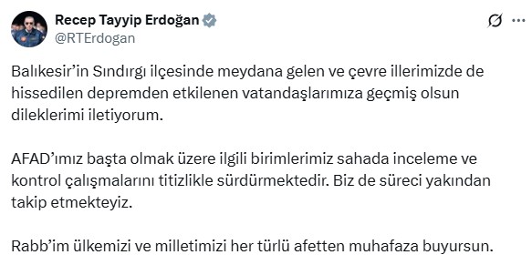 "Balıkesir'in Sındırgı ilçesinde meydana gelen ve çevre illerimizde de hissedilen depremden etkilenen vatandaşlarımıza geçmiş olsun dileklerimi iletiyorum. AFAD'ımız başta olmak üzere ilgili birimlerimiz sahada inceleme ve kontrol çalışmalarını titizlikle sürdürmektedir. Biz de süreci yakından takip etmekteyiz. Rabb'im ülkemizi ve milletimizi her türlü afetten muhafaza buyursun."