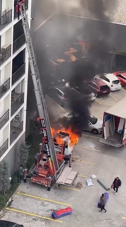 Olay, bugün Bursa'nın Osmangazi ilçesine bağlı Demirtaş Mahallesi'nde bulunan bir site içerisinde meydana geldi. Apartmanın üst katlarındaki bir daireden eşya indirmek için kullanılan mobil vinç, çalışma sırasında aniden tutuştu. Kısa süre içinde alevlerin hızla büyümesiyle birlikte vinç motoru adeta bir alev topuna döndü.