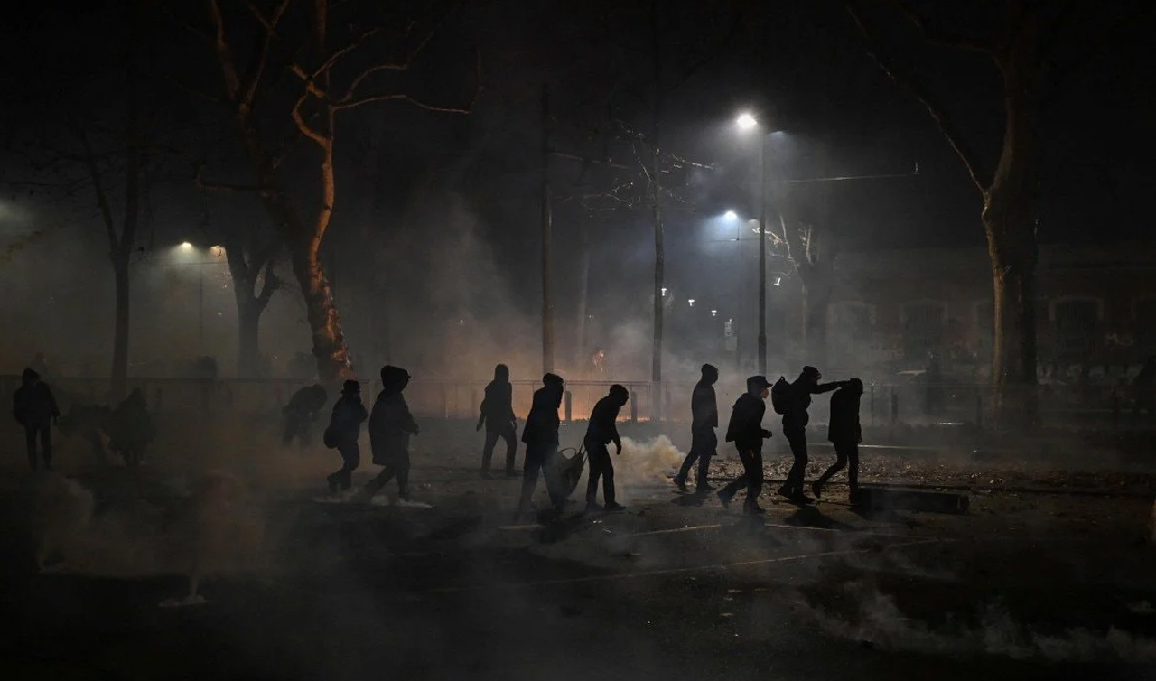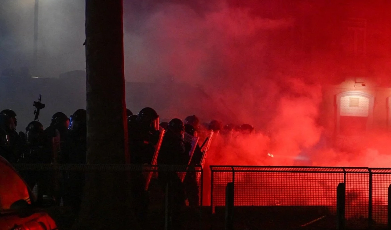 Bir polis minibüsü ve çok sayıda çöp kutusunun ateşe verildiği gösteride, sokaklar savaş alanına döndü.