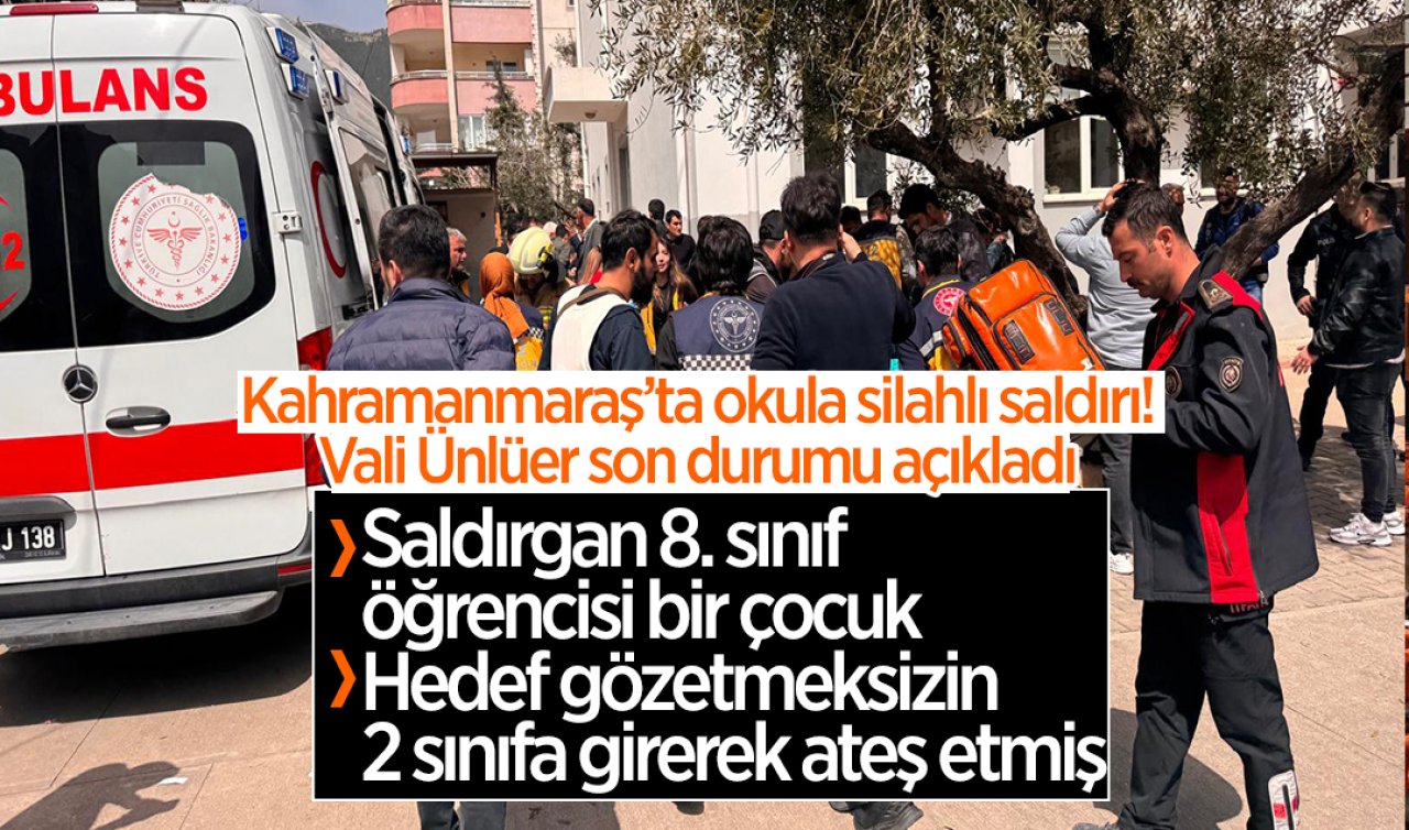 Kahramanmaraş Valisi Mükerrem Ünlüer, kentteki bir okulda yaşanan silahlı saldırıda 3'ü öğrenci, biri öğretmen 4 kişinin hayatını kaybettiğini, 20 kişinin yaralandığını bildirdi.