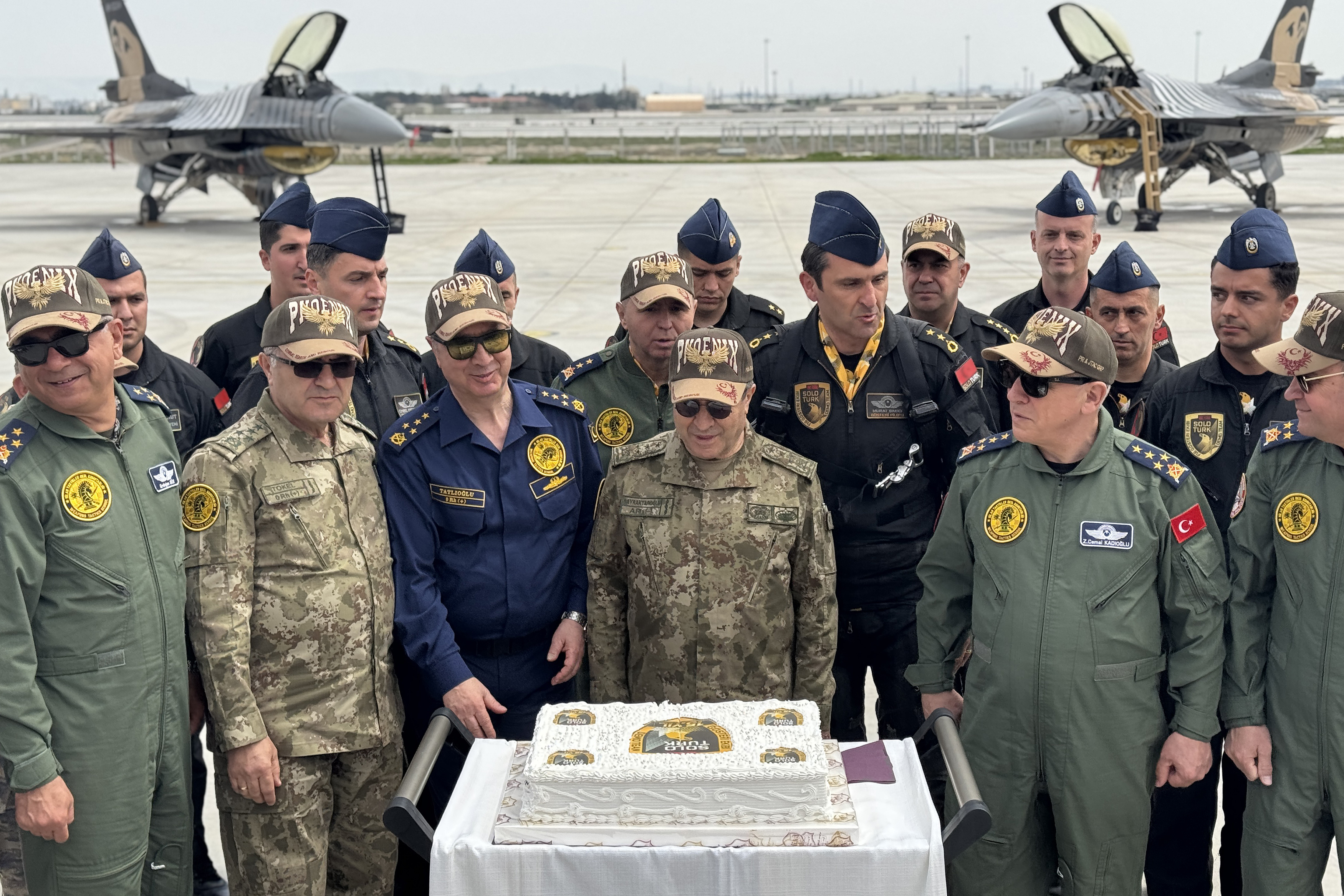 Gösteri uçuşunun ardından pist başında düzenlenen törende, Bayraktaroğlu ve beraberindeki kuvvet komutanları, SOLOTÜRK ekibiyle 15. yıl pastasını kesti.