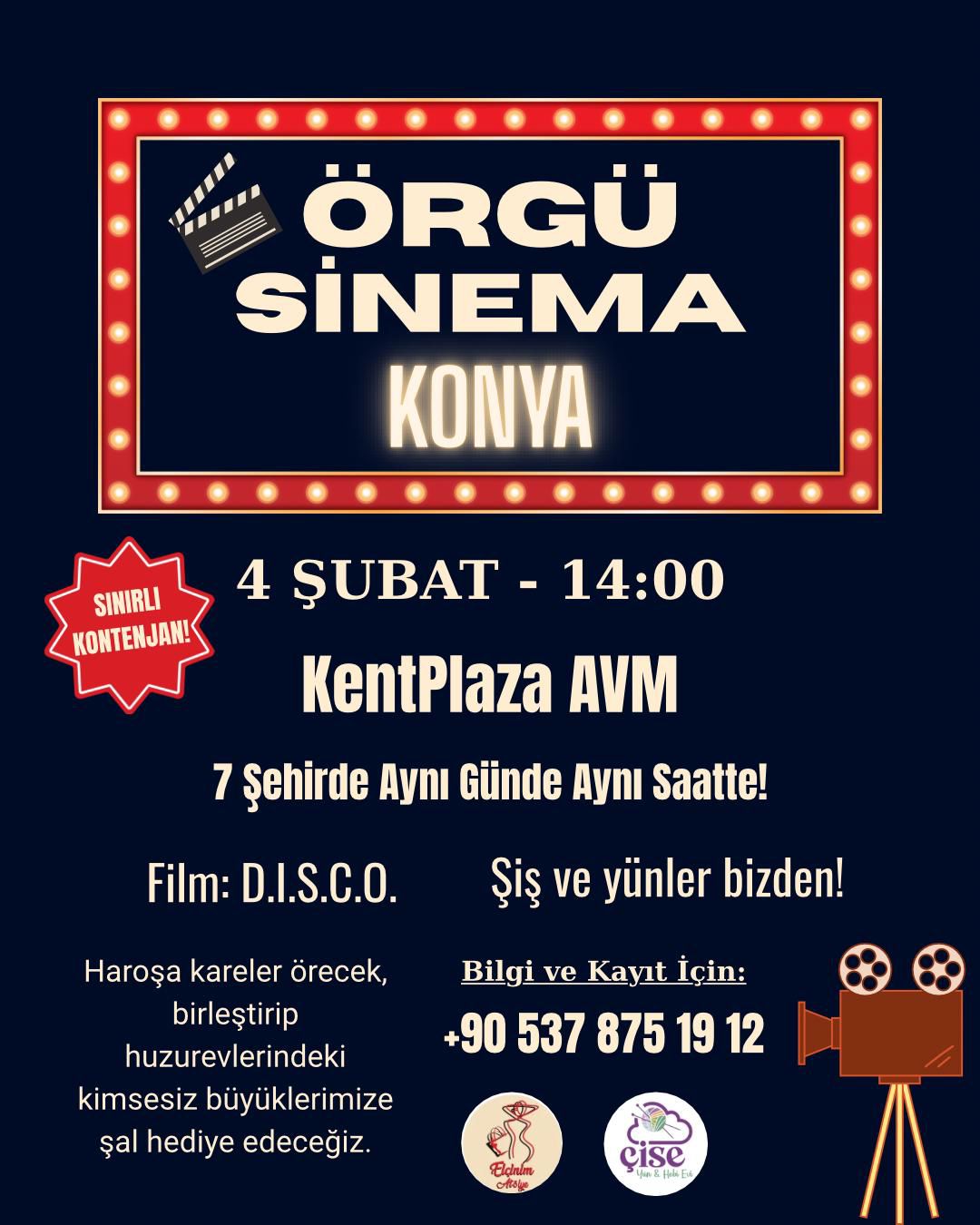 Örgü Sinema etkinliği, yarın saat 14.00'te İzmir, İstanbul, Ankara, Antalya, Bursa, Sakarya ve Konya'da eş zamanlı olarak gerçekleştirilecek. Konya'daki buluşma Kentplaza AVM'de düzenlenecek.