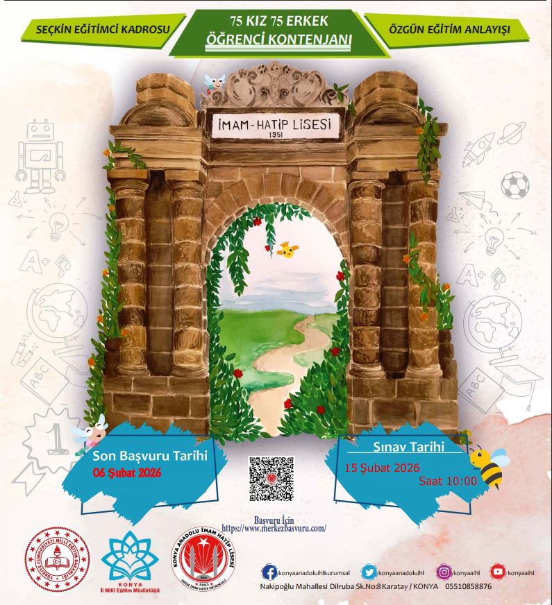 Konya Anadolu İmam Hatip Lisesi Proje ortaokulu sınavla toplam 150 öğrenci alacak. Ortaokula alınacak 75 kız ve 75 erkek öğrenci sınavla belirlenecek. Sınav için başvuruları açıldı ve 06 Şubat 2026 tarihine kadar devam edecek.