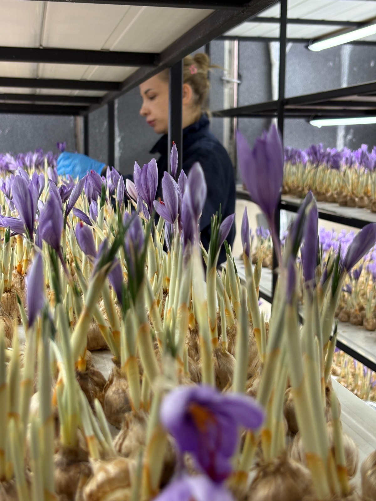 Şeyda Yoldaş, "1 Ekim gibi safranlarımızı odaya aldık, kasım ortası gibi hasat yapmaya başladık. Hasatta elle tek tek çiçekler koparılıyor. Yeşil yapraklar konusunda topraktakine nispeten çok avantajlıyız. Yeşil yapraklarımız çok önemli. Gelecek sene soğan alabilmek adına çok önemli. Onlara zarar vermeden biz burada daha kolay çalışabiliyoruz. Tarlada bu çok mümkün olmuyor. O yüzden tarlada soğan gelişimi biraz yavaş oluyor. Biz her sene burada soğan alıp, soğan satışından ek gelir elde edebiliyoruz. Safran çiçeği, bir gecede açıyor. Ve açtığında yapraklarını iyice açılmadan toplamak bitkinin içeriği açısından, safran stigmalarının içeriği açısından çok önemli. Tarlada, burada, bu noktada da ayrılıyoruz. Burayı ben tarlaya ekseydim; 1,5 dönümden fazlaydı, gün ışımadan toplamak gerekiyordu. Arılar gelmeden, erkek organ polenlerini dağıtmadan safranı toplamak ciddi bir emek maliyeti, işçi maliyeti. Burada biz bu süreci çok daha rahat atlattık. Yine çok çalıştık ama tarladakilere nispeten çok daha rahattık. En azından içeriği kontrol edebiliyoruz, ışıklarımızı kapatabiliyoruz ya da çiçeklenme döneminde bitkinin istediği sıcaklığı, nemi, karbondioksiti ayarlayabiliyoruz. Doğada maalesef bunlar, çok mümkün olmuyor. Risklerle karşı karşıyasınız. Bu şekilde safran çiçeği tam açılmadan çıktığında kopartıp, el ile tek tek, burada 30 bin adet soğan var. Tek tek el ile kopartıp, tek tek el ile içindeki 3 stigmayı kopartıyoruz. Safranı kıymetli yapan aslında bu el işçiliği" diye konuştu.
