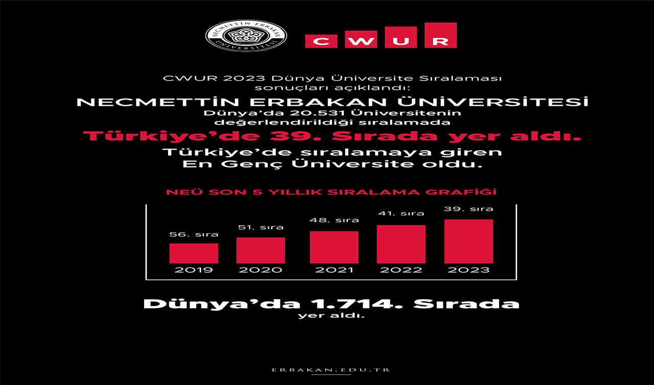 Necmettin Erbakan Üniversitesi (NEÜ), Dünya Üniversite Sıralamaları Merkezi (The Center for World University Rankings - CWUR) tarafından hazırlanan ‘CWUR 2023 Dünya Üniversite Sıralaması’ kapsamında, 96 ülkeden 20 bin 531 yükseköğretim kurumunun değerlendirildiği başarılı üniversiteler sıralamasında Türkiye’de 39’uncu sırada yer alarak, Türkiye’den sıralamaya dahil olan en genç üniversite olma başarısını korudu.