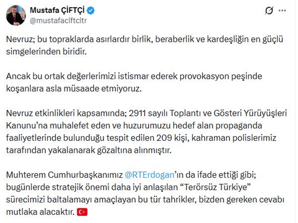 İçişleri Bakanı Mustafa Çiftçi de sanal medya hesabından yaptığı açıklamada, "Nevruz; bu topraklarda asırlardır birlik, beraberlik ve kardeşliğin en güçlü simgelerinden biridir. Ancak bu ortak değerlerimizi istismar ederek provokasyon peşinde koşanlara asla müsaade etmiyoruz.