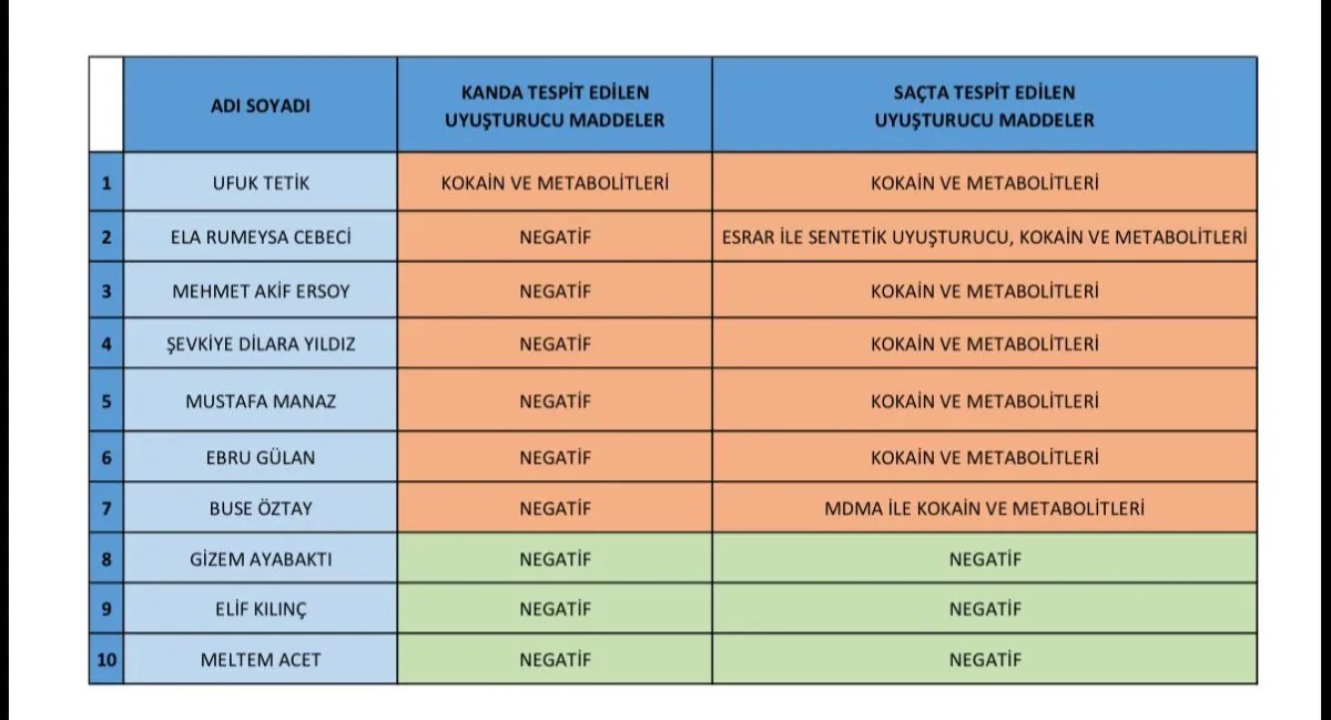 Adli Tıp raporlarına göre, pozitif çıkan örneklerde "kokain ve metabolitleri” tespit edildi. Üç şüphelinin ise test sonuçlarının negatif olduğu belirtildi.