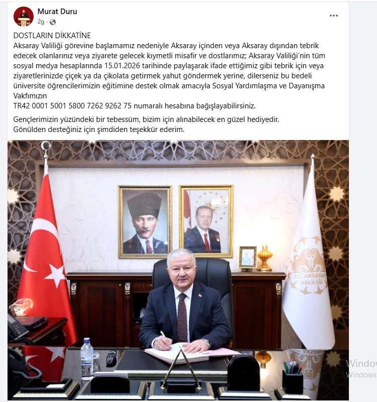 Konuya ilişkin sosyal medya hesabı üzerinden bir paylaşımda bulunan Aksaray Valisi Murat Duru, açıklamasında şu ifadelere yer verdi: "Aksaray Valiliği görevine başlamamız nedeniyle Aksaray içinden veya Aksaray dışından tebrik edecek olanlarınız veya ziyarete gelecek kıymetli misafir ve dostlarımız; Aksaray Valiliği'nin tüm sosyal medya hesaplarında 15.01.2026 tarihinde paylaşarak ifade ettiğimiz gibi tebrik için veya ziyaretlerinizde çiçek ya da çikolata getirmek yahut göndermek yerine, dilerseniz bu bedeli üniversite öğrencilerimizin eğitimine destek olmak amacıyla Sosyal Yardımlaşma ve Dayanışma Vakfımızın TR42 0001 5001 5800 7262 9262 75 numaralı hesabına bağışlayabilirsiniz. Gençlerimizin yüzündeki bir tebessüm, bizim için alınabilecek en güzel hediyedir. Gönülden desteğiniz için şimdiden teşekkür ederim."