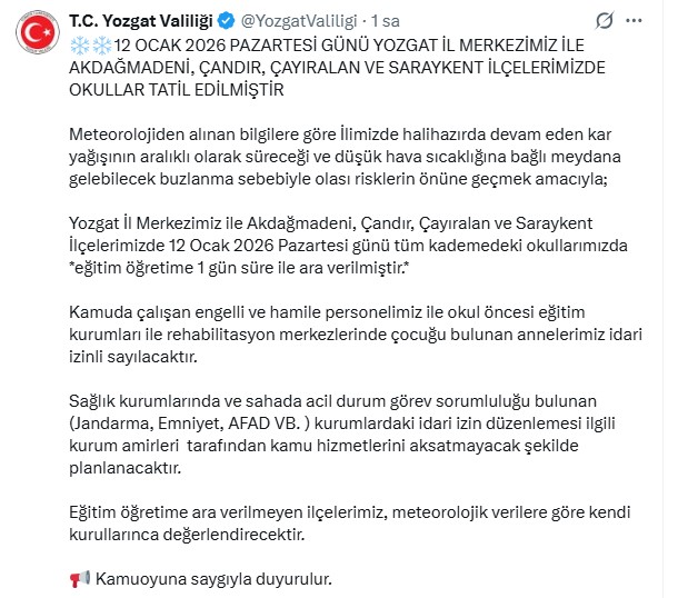 Yozgat İl Merkezimiz ile Akdağmadeni, Çandır, Çayıralan ve Saraykent İlçelerimizde 12 Ocak 2026 Pazartesi günü tüm kademedeki okullarımızda *eğitim öğretime 1 gün süre ile ara verilmiştir.*