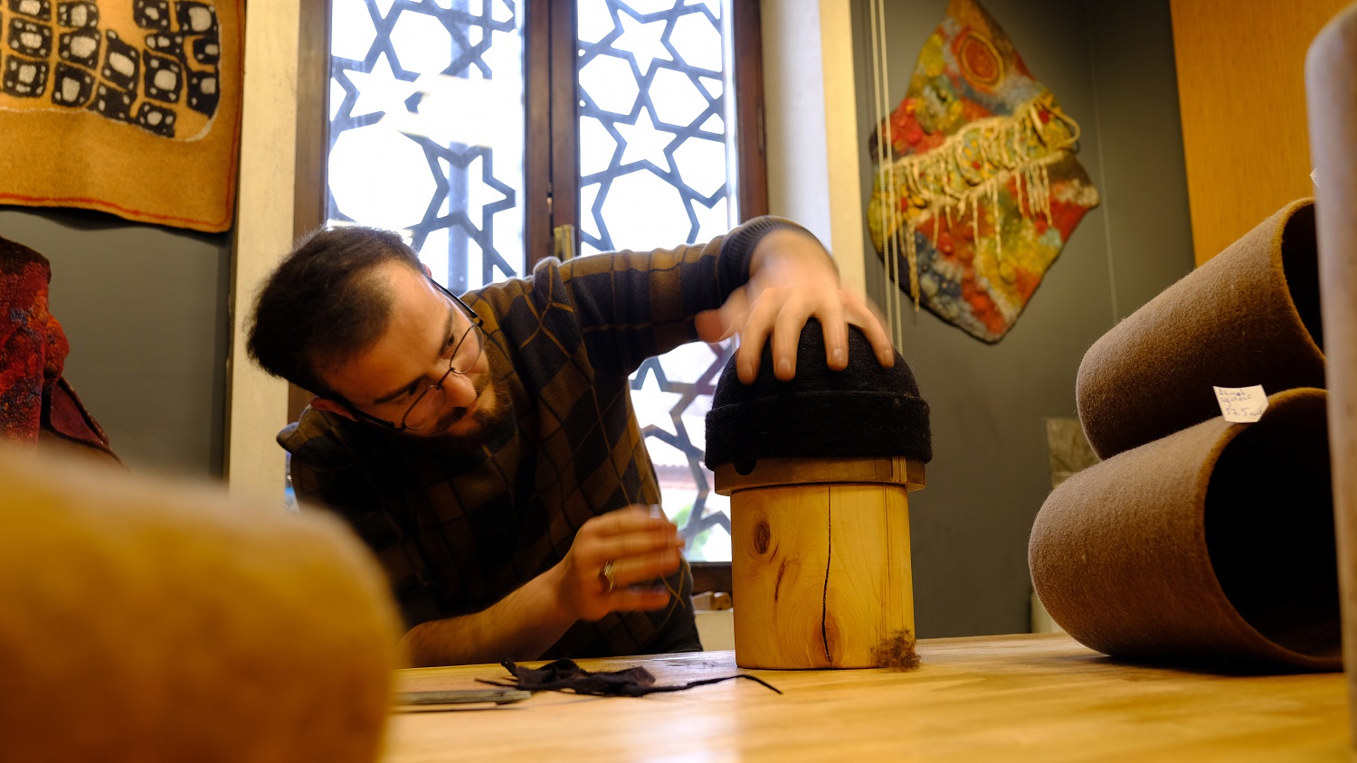 Babasının dedesinin 130 yıl önce başladığı keçeciliği 4'üncü kuşak olarak devam ettiren Yunus Girgiç (34), İrfa Medeniyeti Araştırma ve Kültür Merkezi'ndeki atölyesinde, Hazreti Mevlana'nın 752'nci Vuslat Yıl Dönümü Uluslararası Anma Törenleri nedeniyle yoğunluk yaşıyor.