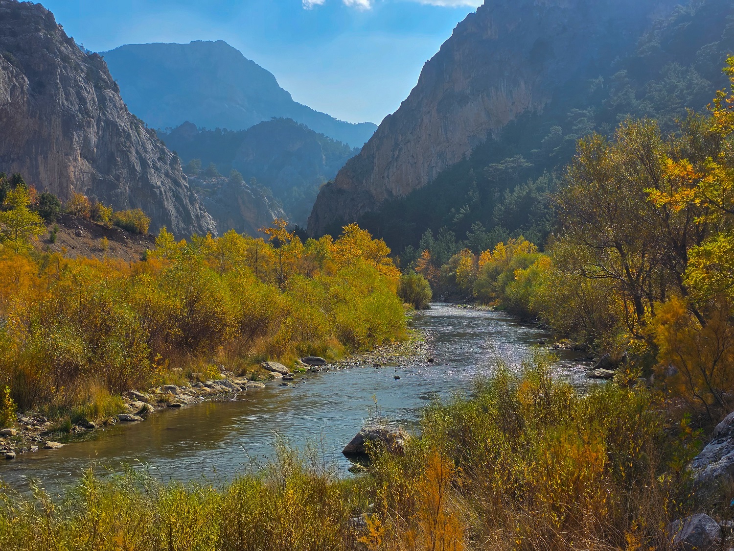 Kasım ayının en gözde doğa rotalarından biri olan Belemedik Tabiat Parkı, yeşil ve sarının bin bir tonunu barındıran çınar ağaçlarıyla adeta bir tabloyu andırdı.