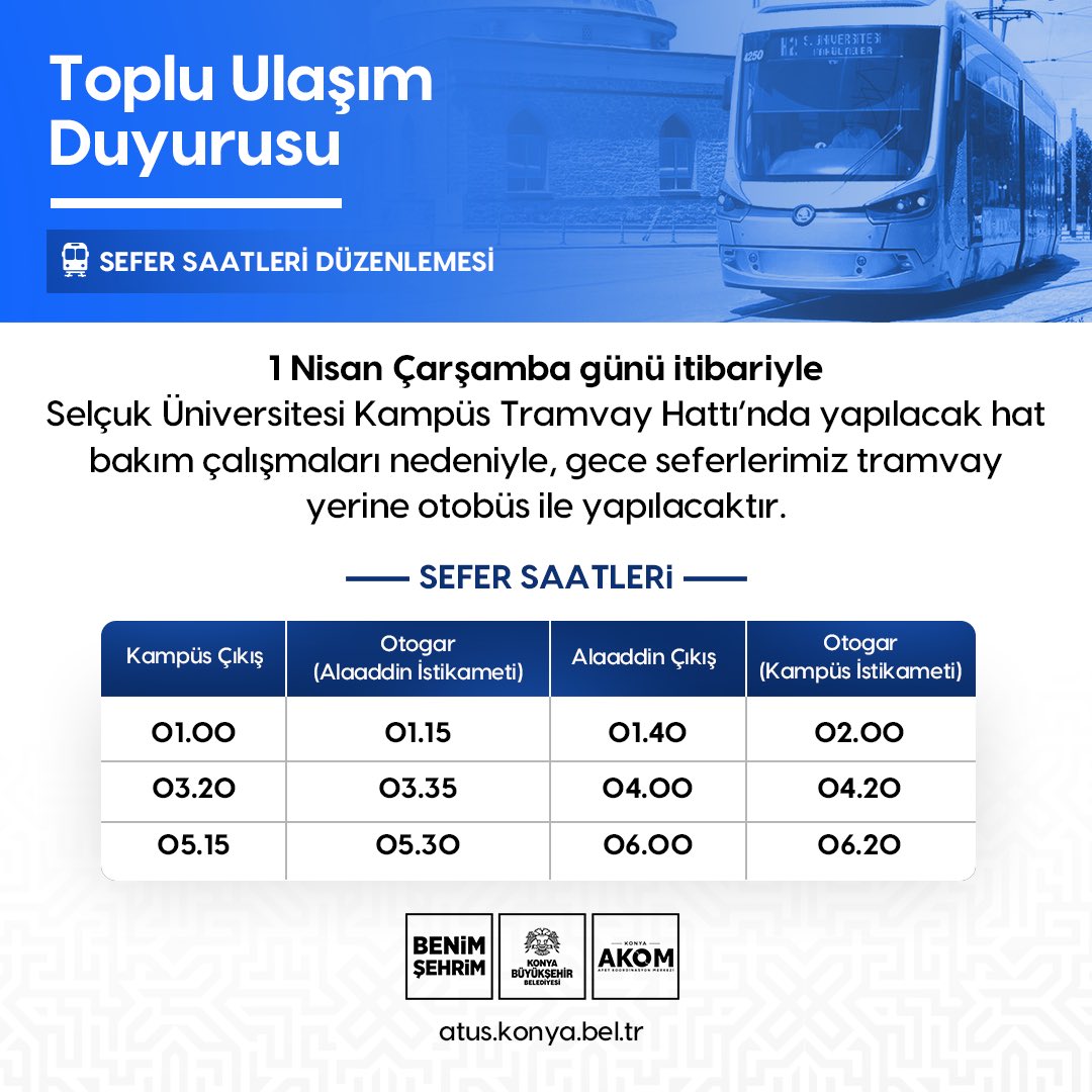 Konya Büyükşehir Belediyesi Afet Koordinasyon Merkezi (AKOM) tarafından yapılan duyuruya göre, Selçuk Üniversitesi Kampüs Tramvay Hattı'nda gerçekleştirilecek bakım çalışmaları nedeniyle gece seferlerinde geçici bir değişikliğe gidildi.