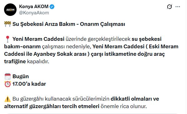 Konya Afet Koordinasyon Merkezi (AKOM), kent trafiğini etkileyen önemli bir altyapı çalışması hakkında bilgilendirme yaptı. Su şebekesinde yürütülecek bakım-onarım çalışması nedeniyle Yeni Meram Caddesi'nin belirli bir bölümü trafiğe kapatıldı.