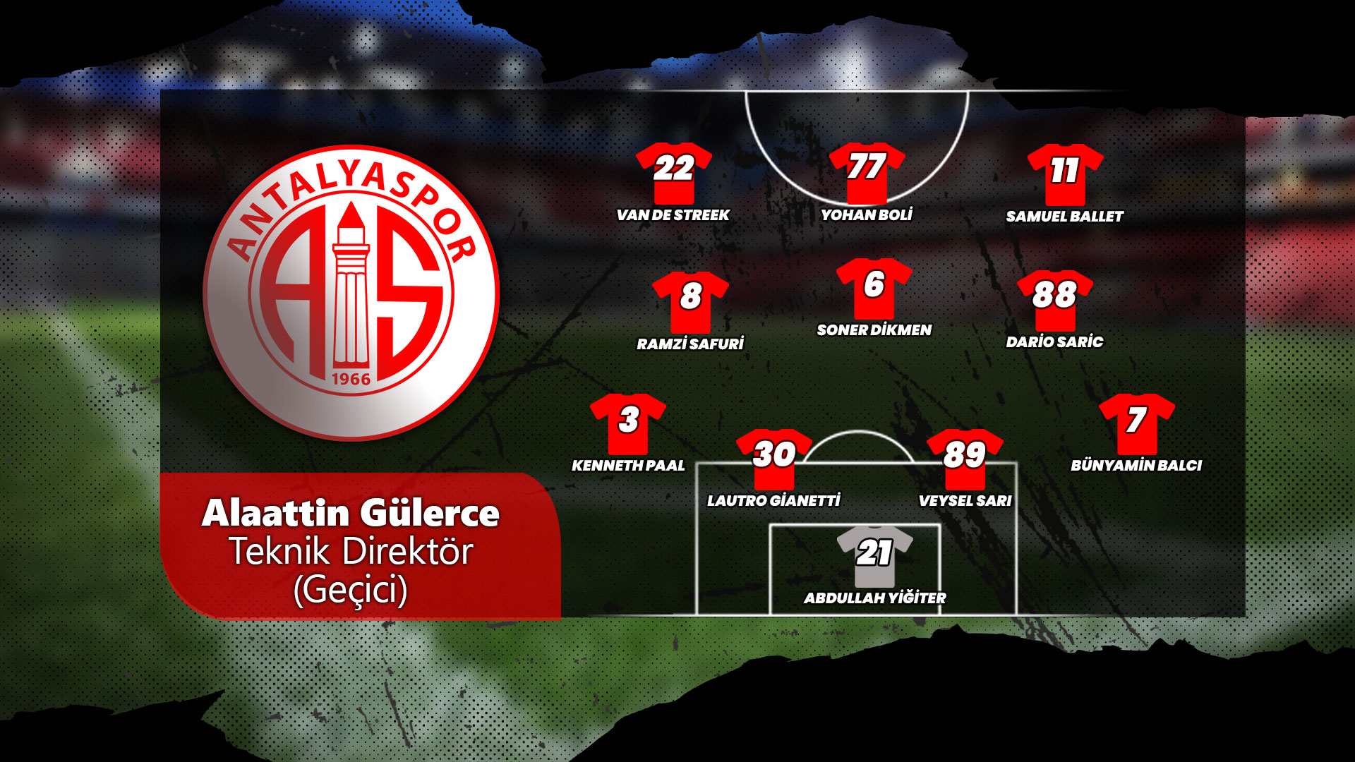 Teknik direktör Erol Bulut'un görevden ayrılmasının ardından yeni teknik patron arayışına giren Antalyaspor; Kocaelispor maçına antrenör Alaattin Gülerce ile çıkmıştı. Antalya ekibinde yeni teknik direktör belli olmazken; bu maçta da takımın başında Gülerce'nin olması bekleniyor. 4-3-3 sistemiyle sahada yer alması beklenen Antalya ekibinin kalesinde Abdullah Yiğiter (21), savunma 4'lüsünde Bünyamin Balcı (7), Veysel Sarı (89), Lautaro Giannetti (30) ve Kenneth Paal (3), 3'lü orta alanda Dario Saric (88), Soner Dikmen (6) ve Ramzi Safuri (8), 3'lü hücum hattında ise Samuel Ballet (11), Yohan Boli (77) ve Sander Van de Streek'in (22) forma giymesi bekleniyor.