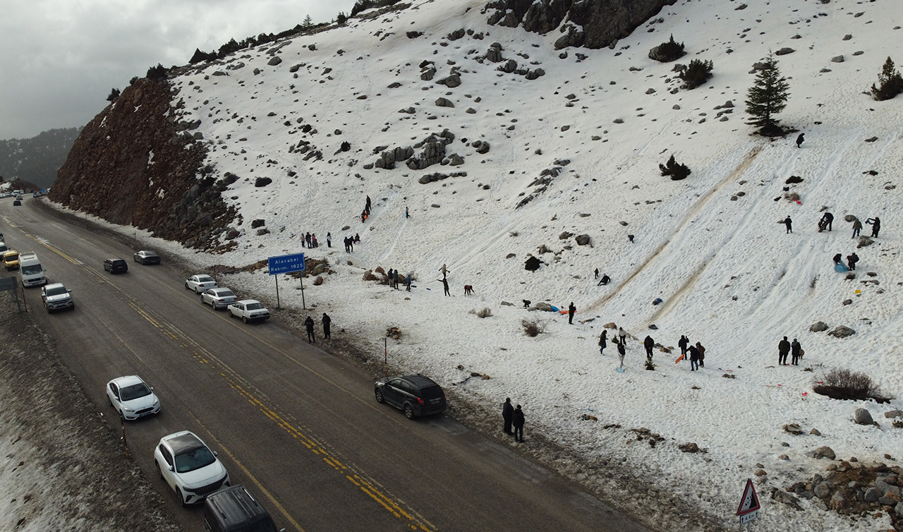 Yarıyıl tatilinde hafta sonu tatilini geçirenler, Antalya-Konya kara yolundaki 1825 rakımlı Alacabel'de karla buluştu. Ziyaretçiler bölgede piknik yaptı, bazıları kar topu oynadı, kaydıraklarla yamaçlardan kaydı. Bir grup off-road sürücüsü de trafiğe kapalı alanlarda sürüş yaptı.