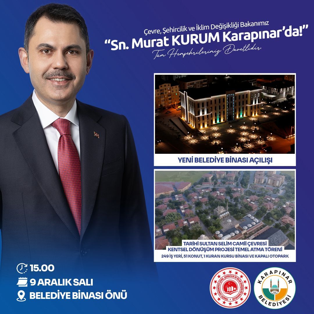 Çevre, Şehircilik ve İklim Değişikliği Bakanı Murat Kurum, 9 Aralık Salı günü Konya'nın Karapınar ilçesini ziyaret edecek. Bakan Kurum, ilçede yapılacak açılış ve temel atma törenlerine katılacak.