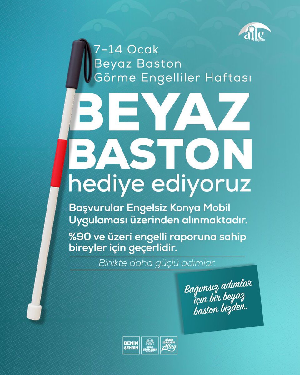 Konya Büyükşehir Belediye Başkanı Uğur İbrahim Altay sosyal medya hesabından, 7–14 Ocak Beyaz Baston Görme Engelliler Haftası kapsamında görme engelli bireyleri yakından ilgilendiren anlamlı bir destek çalışmasını kamuoyuna duyurdu. Başkan Altay, görme engelli vatandaşların günlük yaşamlarını daha bağımsız ve güvenli bir şekilde sürdürebilmeleri amacıyla beyaz baston dağıtımı yapılacağını açıkladı.