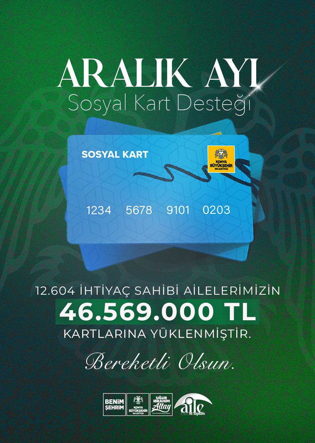 Konya Büyükşehir Belediye Başkanı Uğur İbrahim Altay, sosyal medya hesabından yaptığı açıklamada Aralık ayı Sosyal Kart desteğinin ihtiyaç sahibi ailelerin hesaplarına ulaştırıldığını duyurdu. Başkan Altay, destek ödemelerinin tüm ailelere hayırlı olmasını diledi.