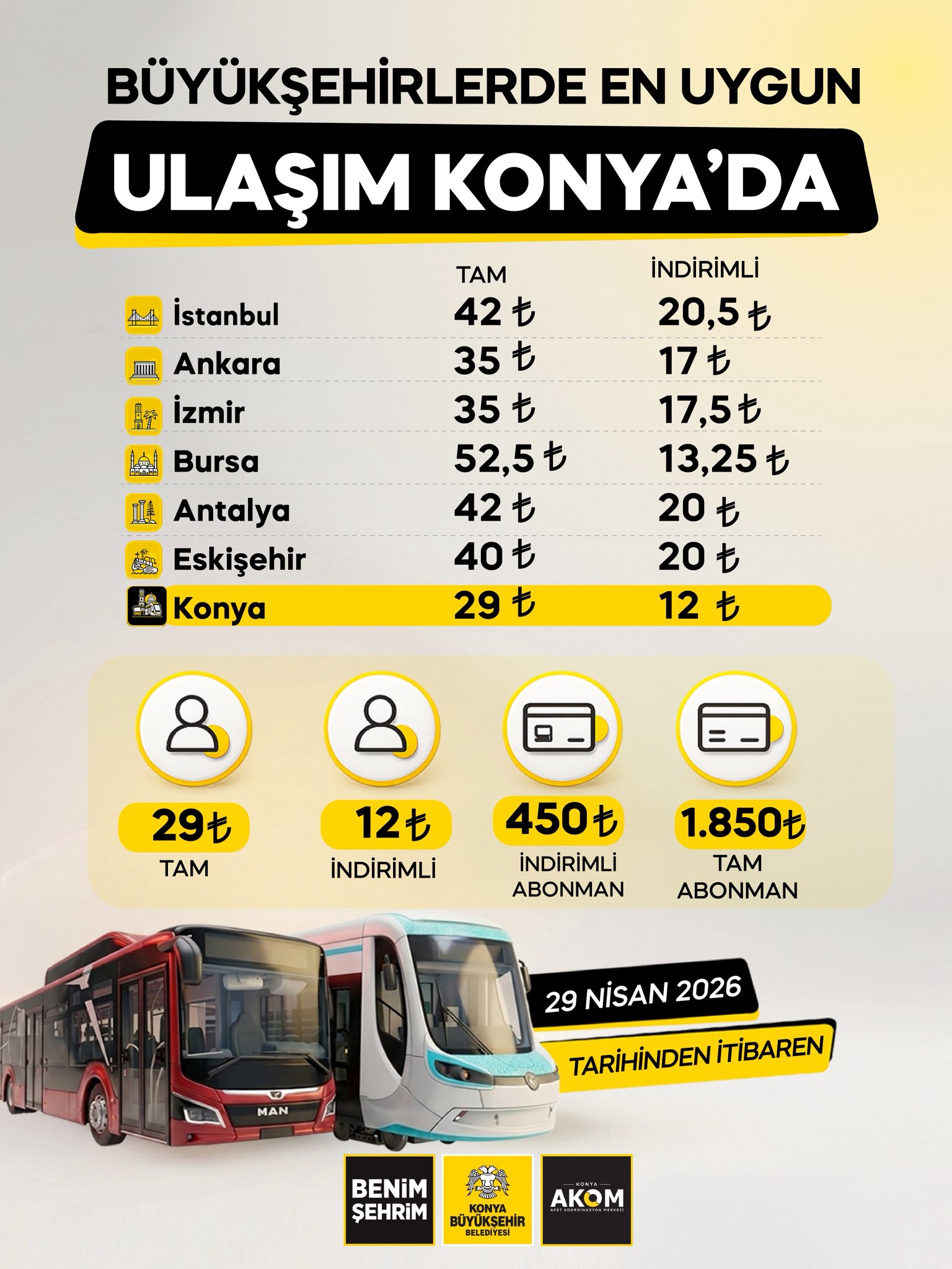 Konya Büyükşehir Belediyesi, 29 Nisan 2026 itibarıyla geçerli olacak toplu ulaşım tarifelerini duyurdu. Açıklanan verilere göre Konya, büyükşehirler arasında en uygun ulaşım ücretine sahip şehirler arasında yer aldı.