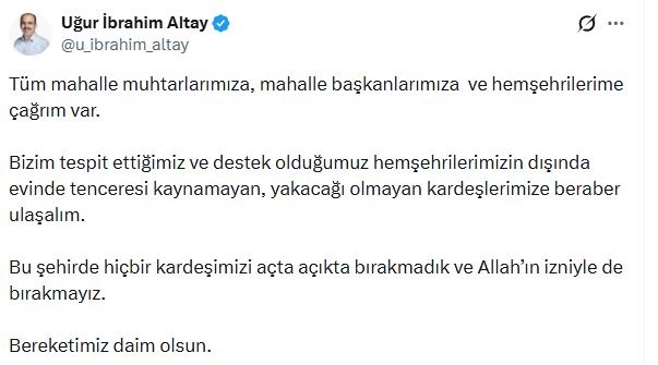 Konuyla ilgili bir duyuru yapan Başkan Altay, "Tüm mahalle muhtarlarımıza, mahalle başkanlarımıza ve hemşehrilerime bir çağrım var. Bizim tespit ettiğimiz ve destek olduğumuz hemşehrilerimizin dışında evinde tenceresi kaynamayan, yakacağı olmayan kardeşlerimize beraber ulaşalım. Bu şehirde hiçbir kardeşimizi aç ve açıkta bırakmadık ve Allah'ın izniyle de bırakmayız. Bereketimiz daim olsun” ifadelerini kullandı.