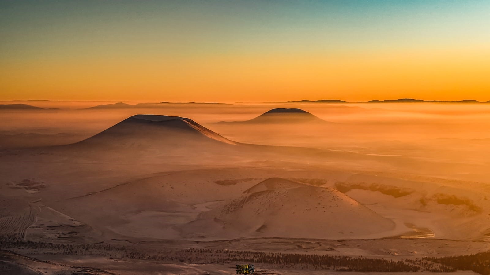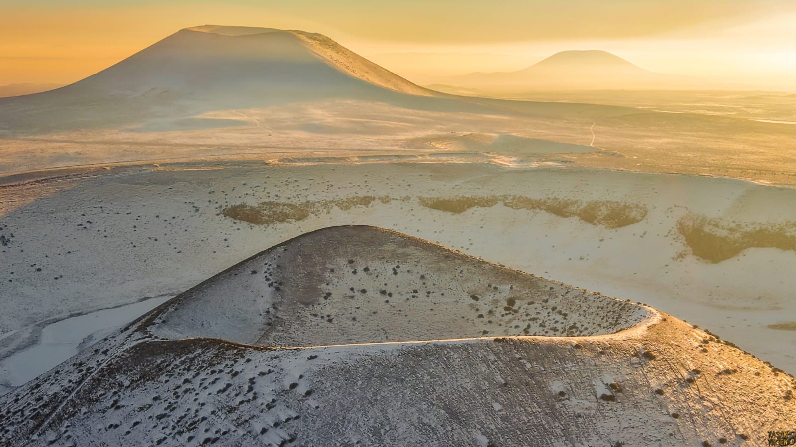 Akşam saatlerinde gökyüzünün kızıl ve turuncu tonlara bürünmesiyle birlikte karla kaplanan Meke Gölü, izleyenleri mest etti. Beyaz örtüyle çevrelenen Meke Gölündeki manzara dron ile görüntülendi.