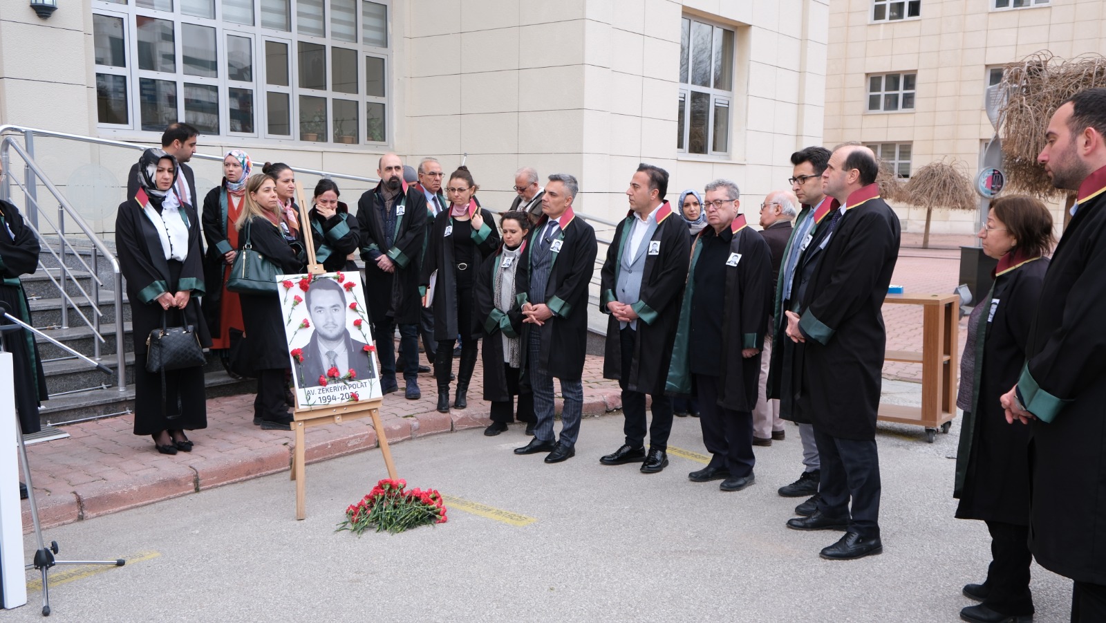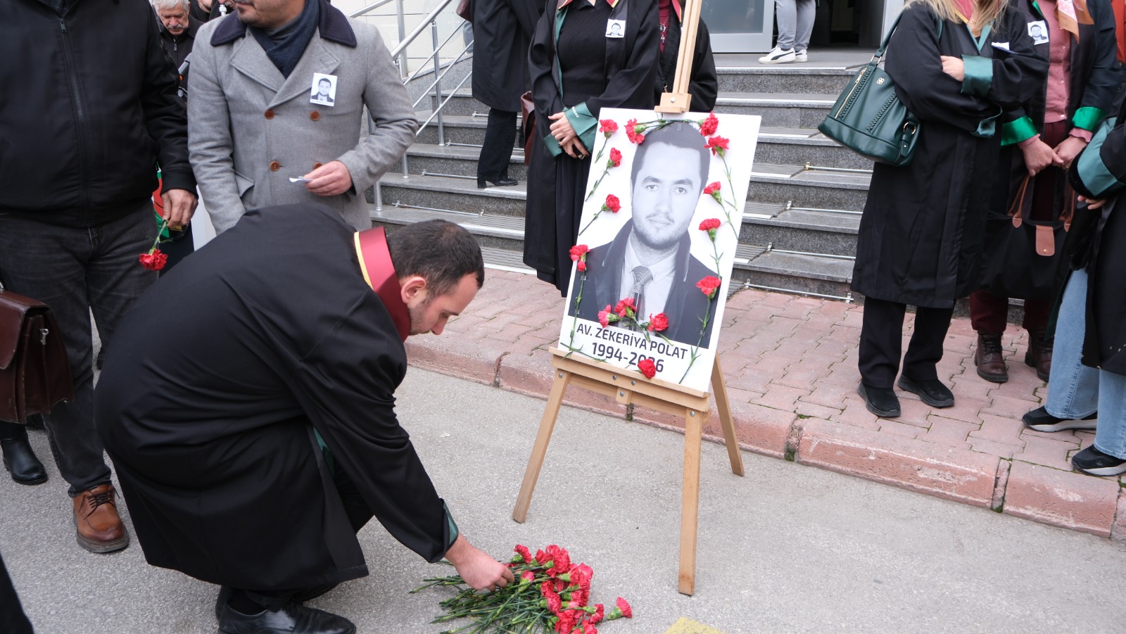Basın açıklamasının ardından avukatlar, saldırı sonucu hayatını kaybeden meslektaşları Zekeriya Polat'ın fotoğrafına kırmızı karanfiller bıraktı.