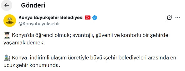 Konya Büyükşehir Belediyesi, sosyal medya hesabından yaptığı paylaşımla Konya'da öğrenci olmanın sunduğu avantajlara dikkat çekti. Paylaşımda, şehrin güvenli ve konforlu yaşam koşullarının yanı sıra öğrenciler için sağlanan ekonomik imkânlar ön plana çıkarıldı.
