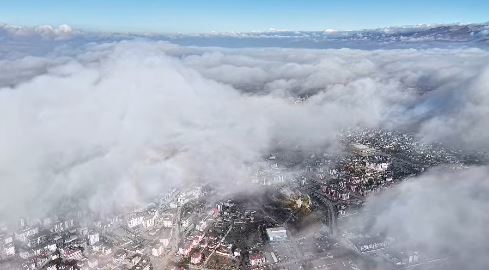 Yer seviyesinde yoğun şekilde hissedilen sisin üzerinde uçurulan drone, Karapınar'ı kaplayan bulut denizini gözler önüne serdi. Sis ve bulut tabakasının arasında kalan ilçe, ortaya çıkan manzarayla adeta masalsı bir atmosfere büründü.