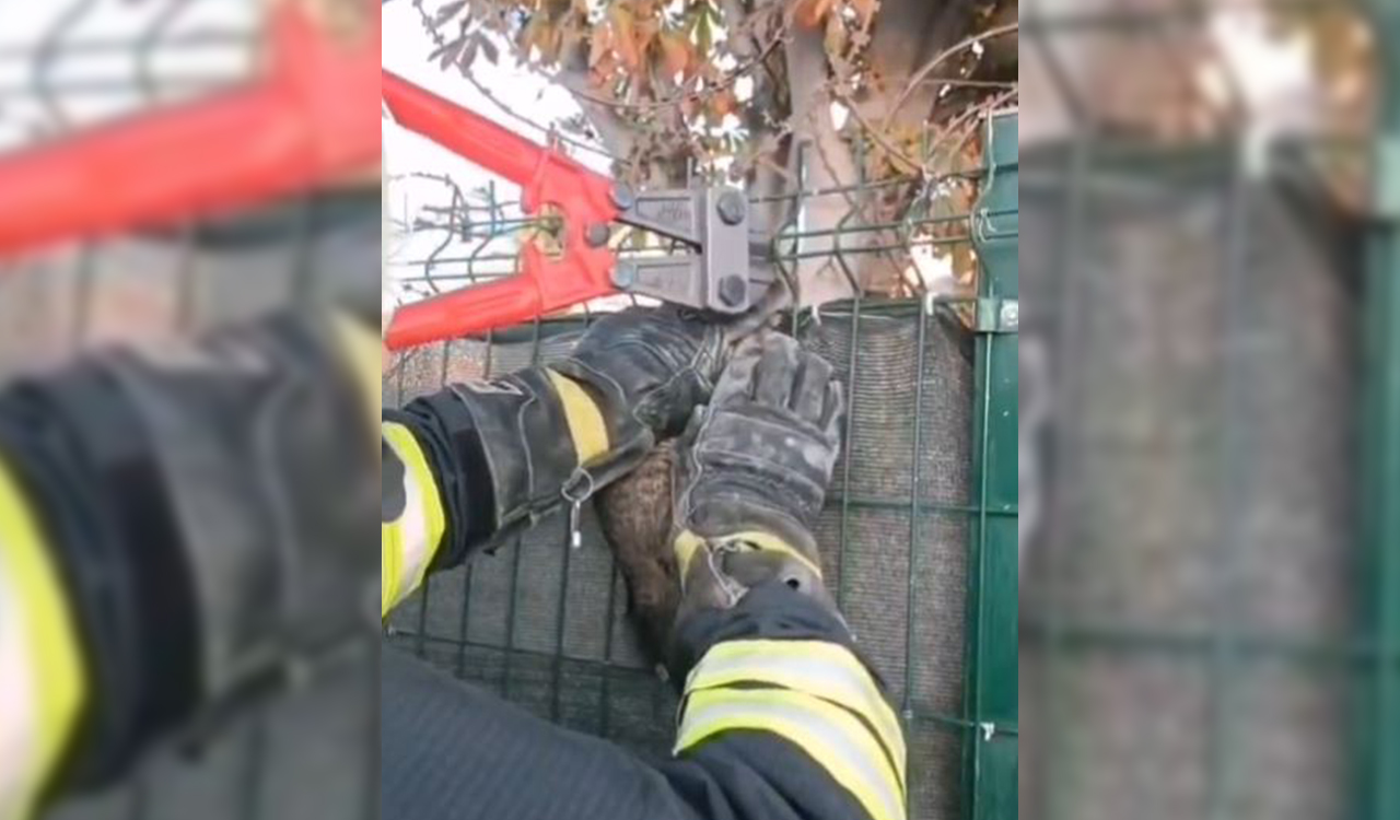 Korkan kedinin yaralanmaması için bir itfaiye eri yavruyu tuttu diğeri telleri tek tek kesti. Dakikalar içinde özgürlüğüne kavuşan kedi hemen kaçıp gözden kayboldu.