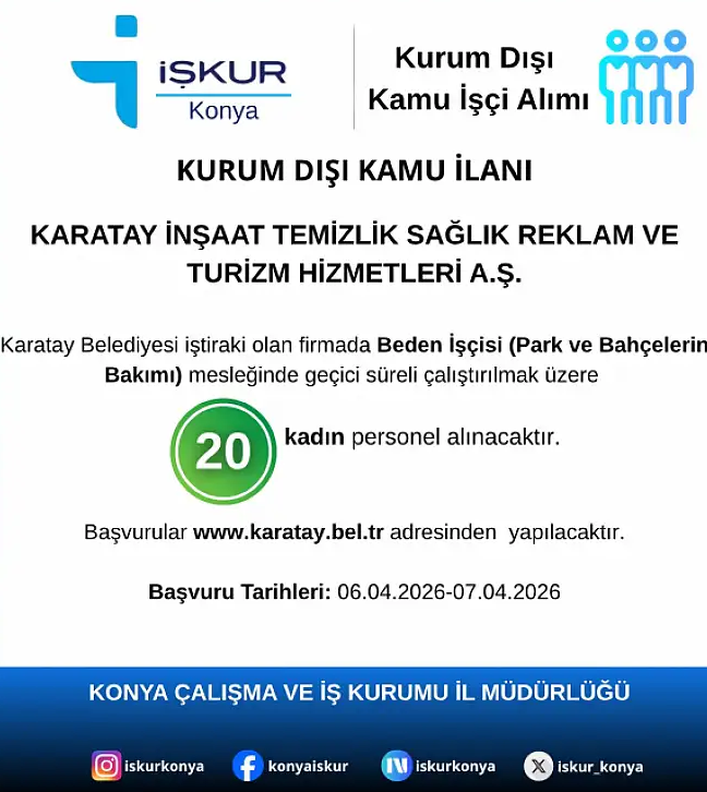 İŞKUR Konya üzerinden yayımlanan yeni bir ilana göre, Karatay Belediyesi bünyesinde personel alımı yapılacak. Belediye iştiraki olan Karatay İnşaat Temizlik Sağlık Reklam ve Turizm Hizmetleri A.Ş., geçici süreyle istihdam edilmek üzere işçi alımı gerçekleştirecek.