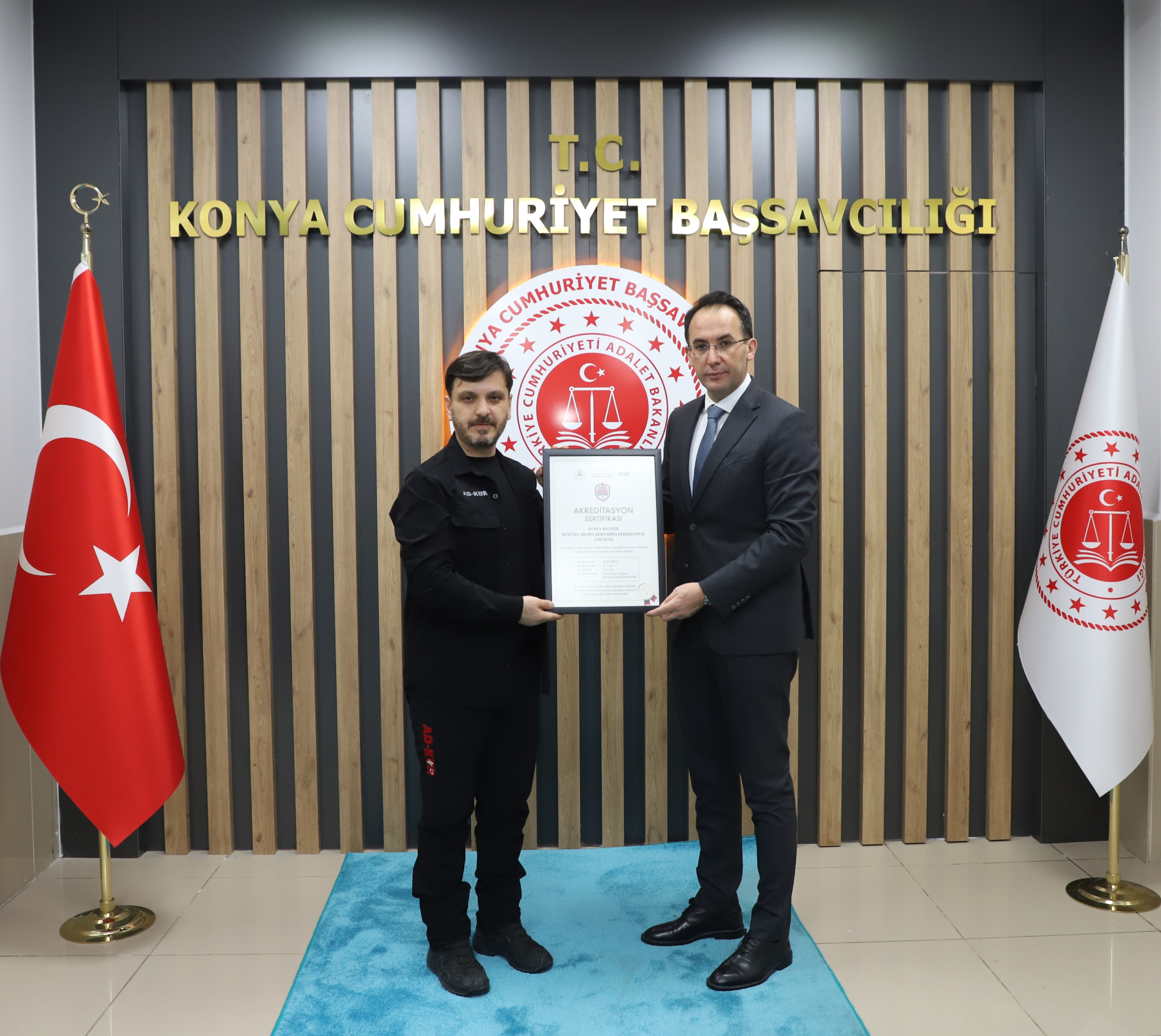 Ekip üyeleri, eğitim sürecinin ardından Afet ve Acil Durum Yönetimi Başkanlığı (AFAD) tarafından tescil edilen akreditasyon belgesini Konya Cumhuriyet Başsavcısı Cuma Çoban'a makamında takdim etti.