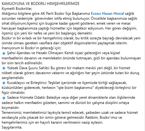 İstifasının ardından bir açıklama yapan Hasan Hıncal, görev süresi boyunca kendisine destek veren parti teşkilatına ve Bozkır halkına teşekkür etti. Hıncal, birlikte çalıştığı tüm teşkilat mensuplarına da emekleri ve katkıları dolayısıyla şükranlarını sundu.