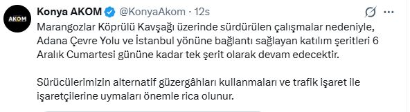 "Marangozlar Köprülü Kavşağı üzerinde sürdürülen çalışmalar nedeniyle, Adana Çevre Yolu ve İstanbul yönüne bağlantı sağlayan katılım şeritleri 6 Aralık Cumartesi gününe kadar tek şerit olarak devam edecektir. Sürücülerimizin alternatif güzergâhları kullanmaları ve trafik işaret ile işaretçilerine uymaları önemle rica olunur."