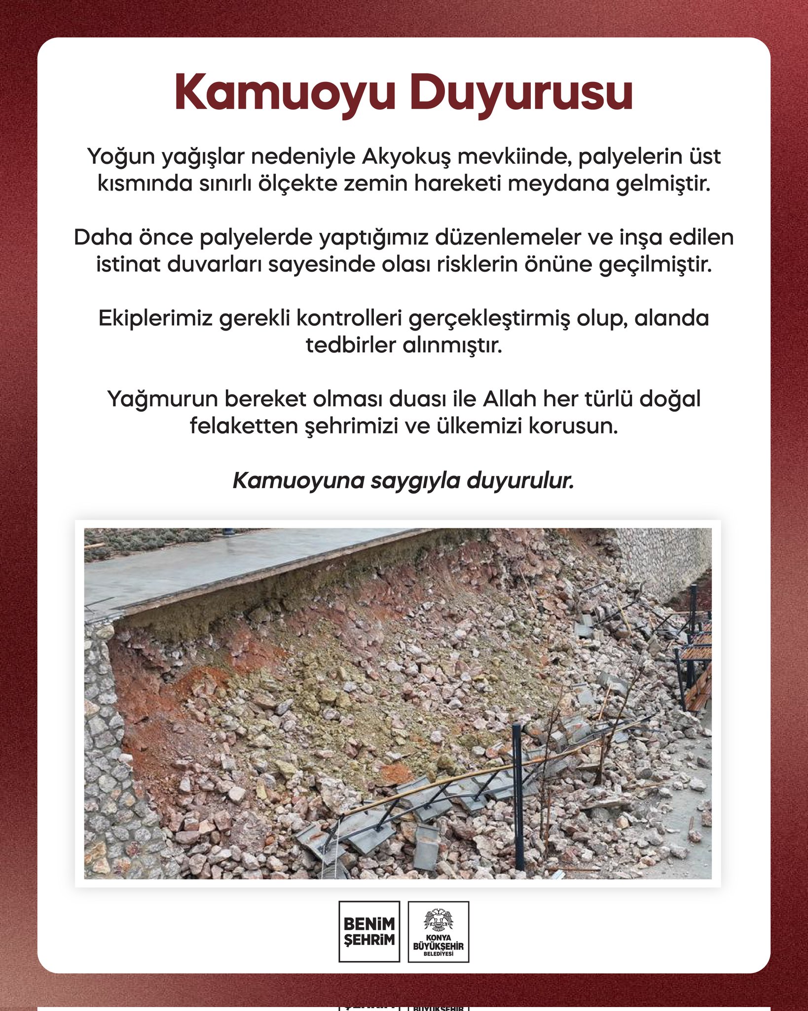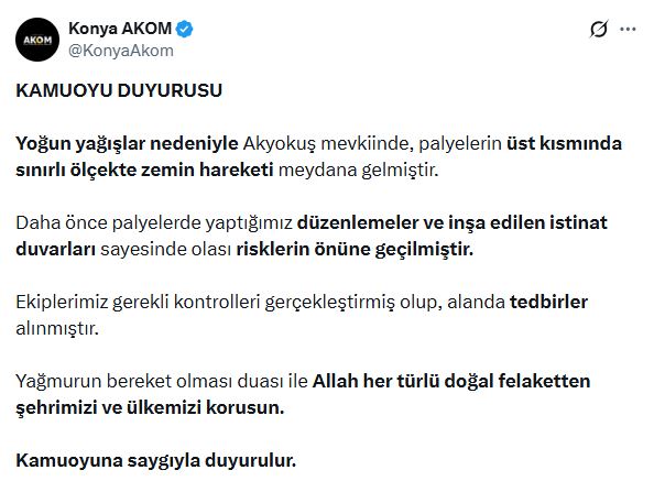 Konya'da etkili olan yoğun yağışlar sonrası Akyokuş mevkisinde sınırlı ölçekte zemin hareketi meydana geldi. Konya Büyükşehir Belediyesi tarafından yapılan açıklamada, olayın palyelerin üst kısmında oluştuğu ve risk oluşturabilecek durumlara karşı gerekli önlemlerin alındığı bildirildi.