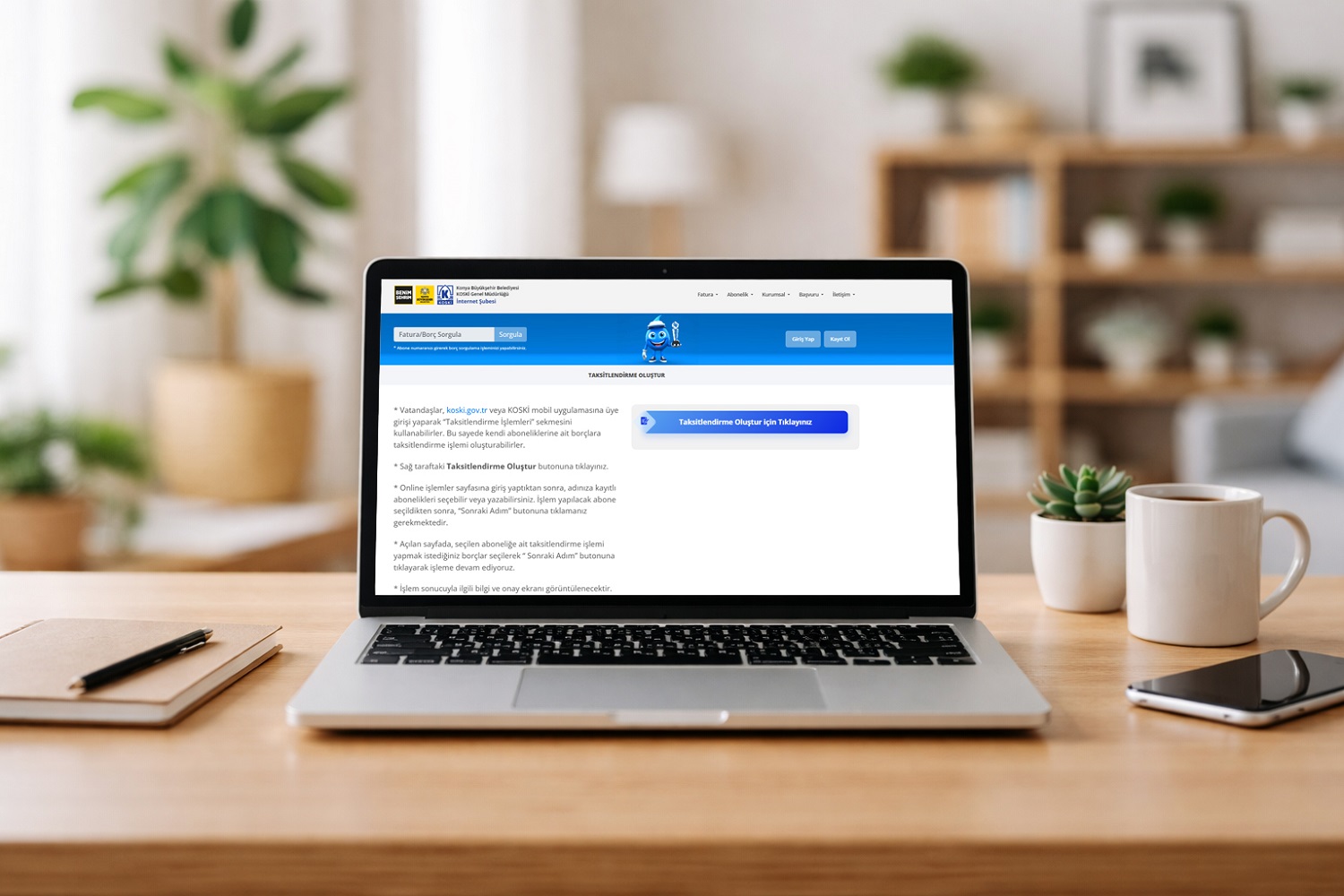 Online taksitlendirme işlemi, KOSKİ'nin resmi internet sitesi veya Mobil KOSKİ uygulaması üzerinden üyelik girişi yapılarak başlatılıyor. Ana sayfada yer alan E-Taksit seçeneği üzerinden Online İşlemler bölümüne geçiş yapılıyor. Bu aşamada adrese kayıtlı abonelik seçilerek işlem adımlarına devam ediliyor.