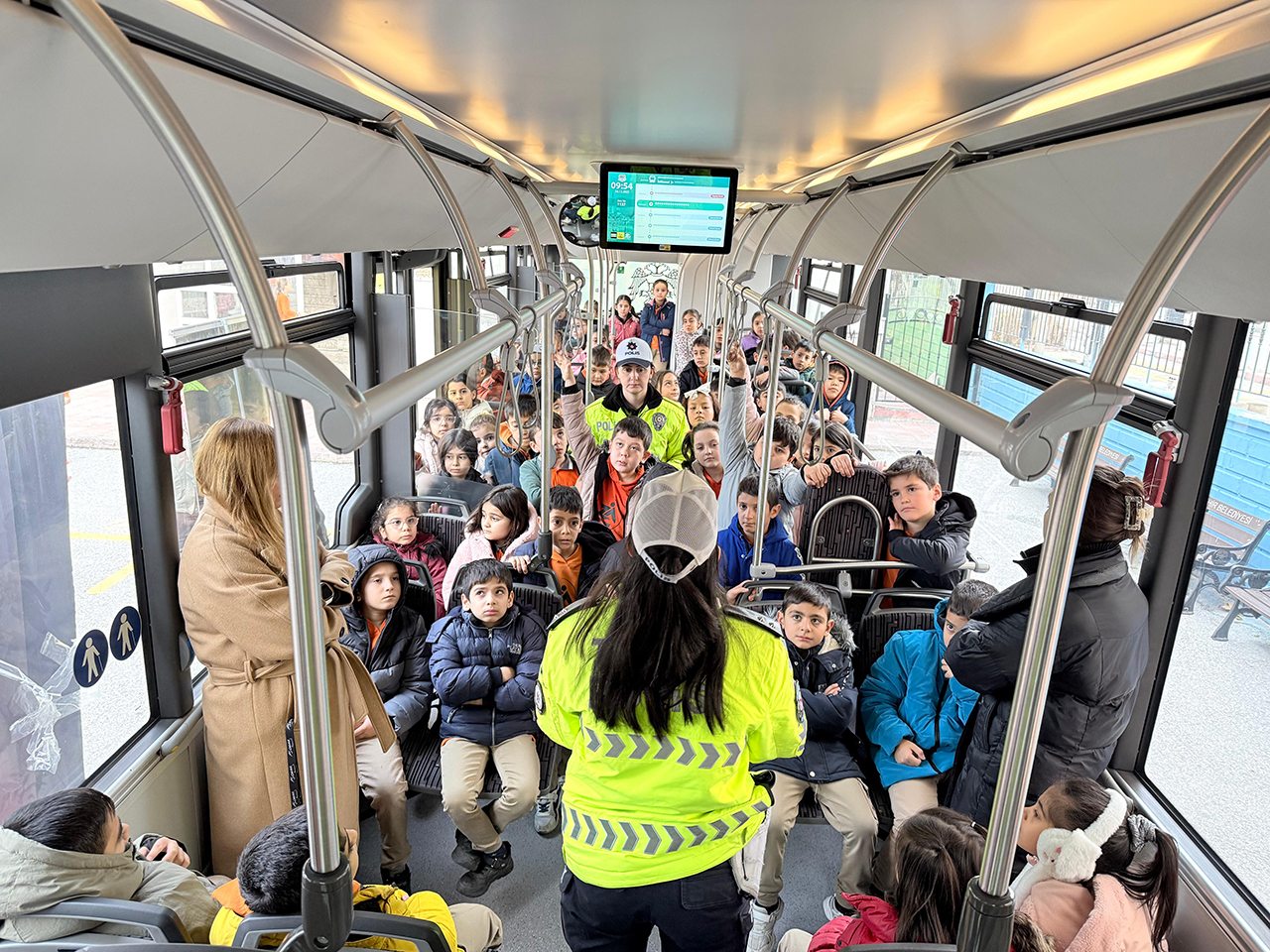 "Trafikte Nezaket ve Görgü Kuralları Projesi” kapsamında hayata geçirilen çalışmayla toplu ulaşımda kullanılmakta olan bir otobüs ile okullara gidilerek, otobüs içerisinde toplu ulaşımda nezaket ve görgü kuralları hakkında öğrencilere bilgilendirmeler yapılıyor.