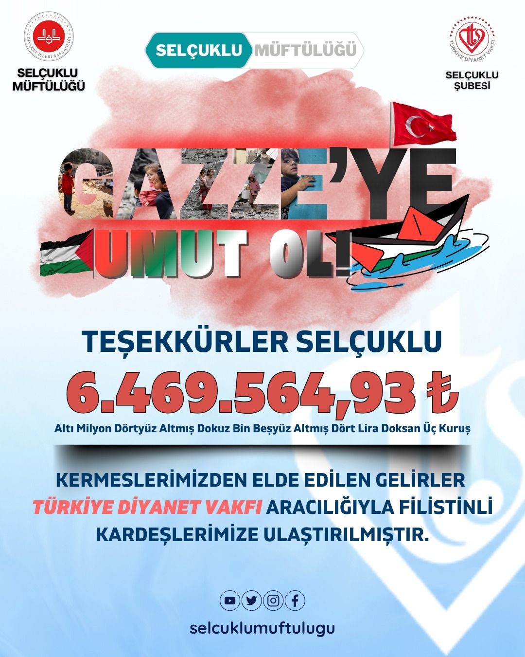 Düzenlenen kermeslerden ve hayırsever vatandaşların katkılarından Kasım ve Aralık ayın içerisinde elde edilen toplam 6.469.564,93 TL gelirin, Filistinli ihtiyaç sahiplerinin yararına kullanılmak üzere Türkiye Diyanet Vakfı Selçuklu Şubesi tarafından teslim alındığı ve yerine ulaştırıldığı bildirildi.