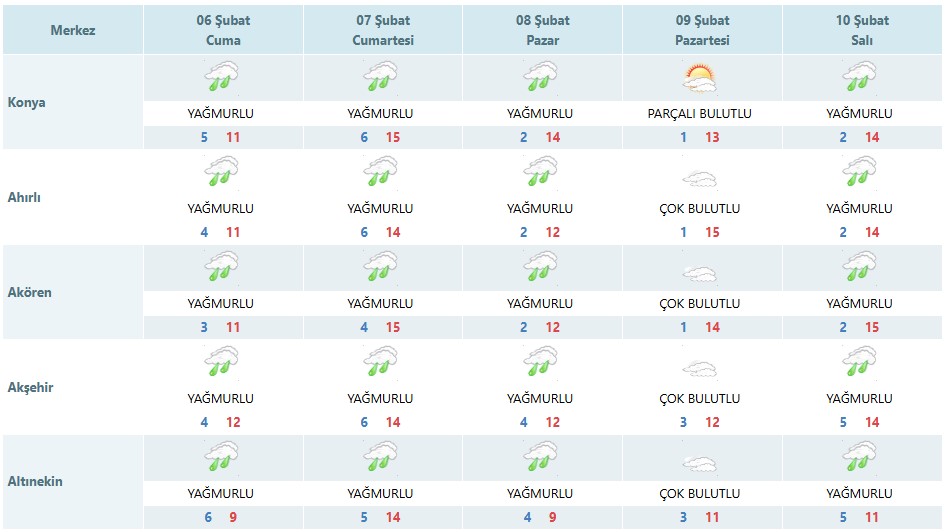 6 Şubat Cuma günü Konya genelinde yağış beklenirken, hafta sonu boyunca yağışların merkez dâhil 31 ilçede etkisini sürdürmesi öngörülüyor. Bazı ilçelerde yağmurla birlikte karla karışık yağmur da bekleniyor. Vatandaşların özellikle hafta sonu için tedbirli olmaları istendi.
