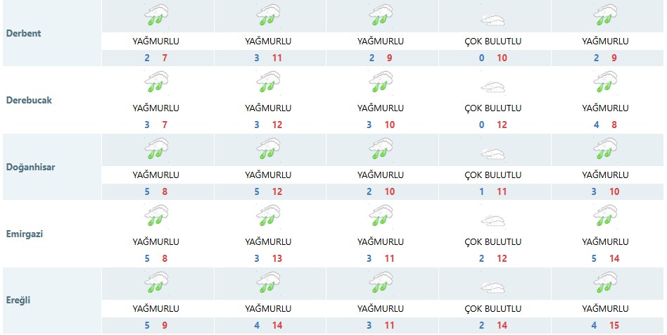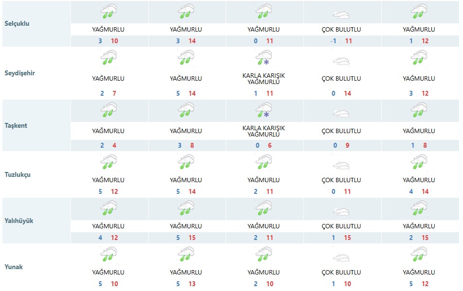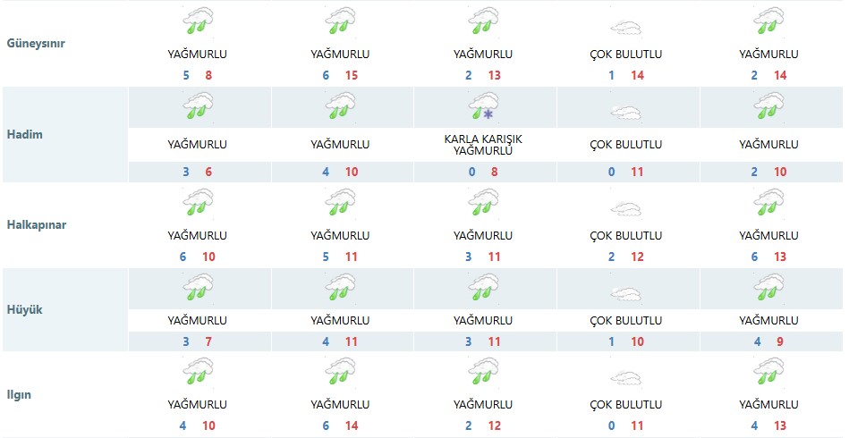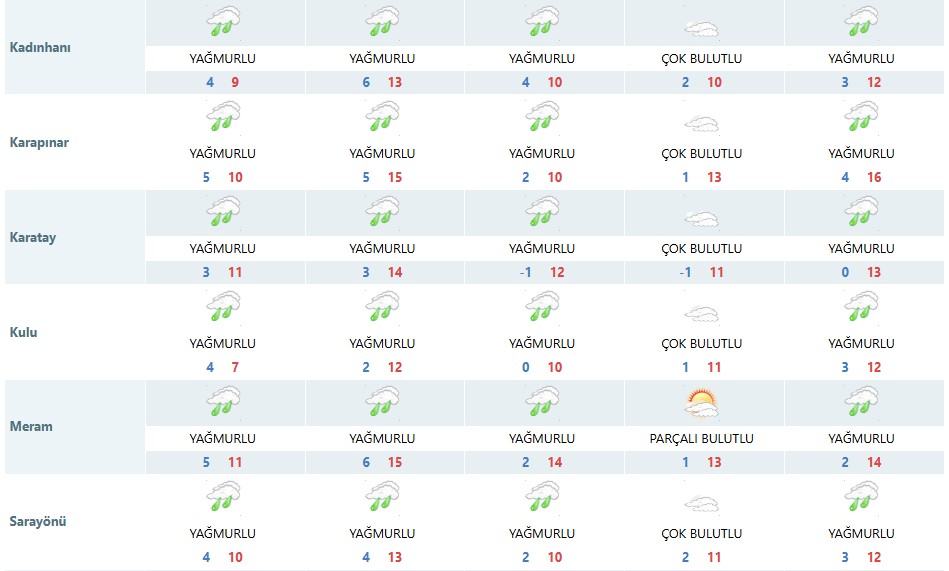 Meteoroloji Genel Müdürlüğü, Konya'nın merkez ilçesi dâhil olmak üzere 31 ilçeyi kapsayan beş günlük hava tahmin raporunu yayımladı. Rapora göre Konya'da yağışlı hava dalgası yarından itibaren etkisini göstermeye başlayacak.
