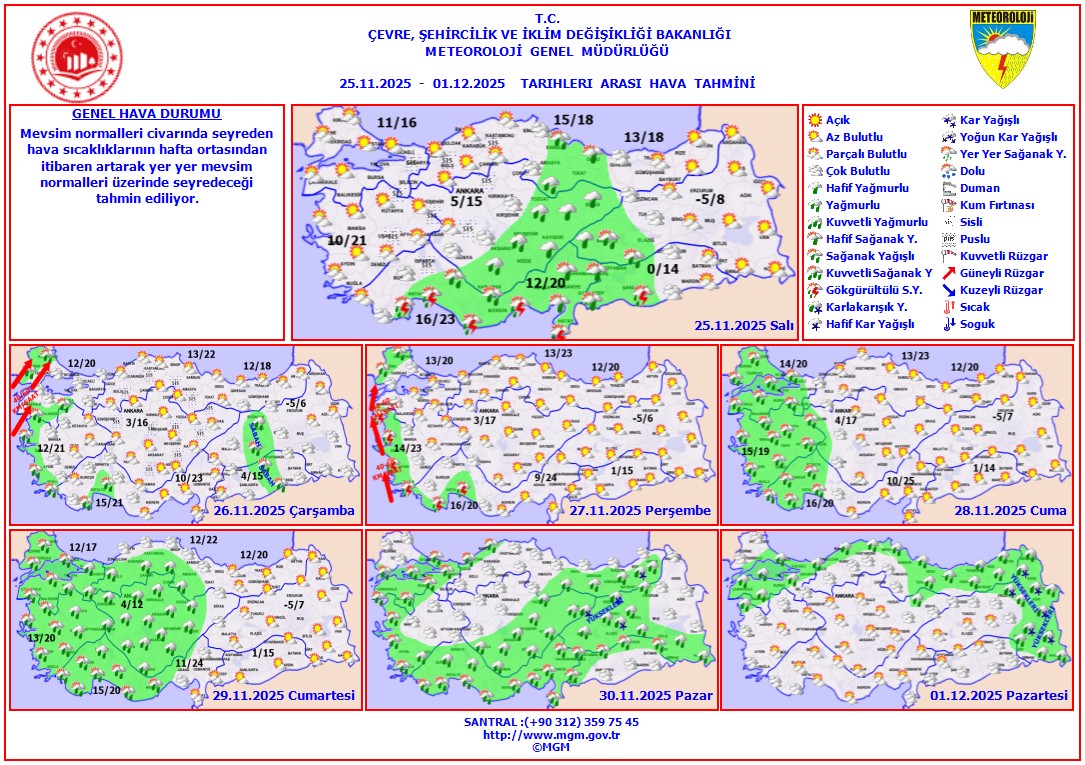 Hafta sonuna doğru yağışların genişlemesi bekleniyor. 29 Kasım Cumartesi günü Konya'nın merkez dahil 31 ilçesinde yağış görüleceği tahmin ediliyor. Yağışların yer yer etkisini artırabileceği ve hava sıcaklıklarında düşüşün devam edeceği bildirildi.