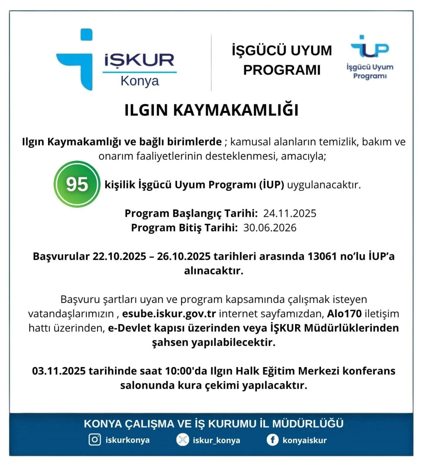 Konya Çalışma ve İş Kurumu İl Müdürlüğü (İŞKUR) tarafından yürütülen İşgücü Uyum Programı (İUP) kapsamında, Ilgın Kaymakamlığı ve bağlı birimlerinde temizlik, bakım ve onarım faaliyetlerinin desteklenmesi amacıyla 95 kişilik program uygulanacak.