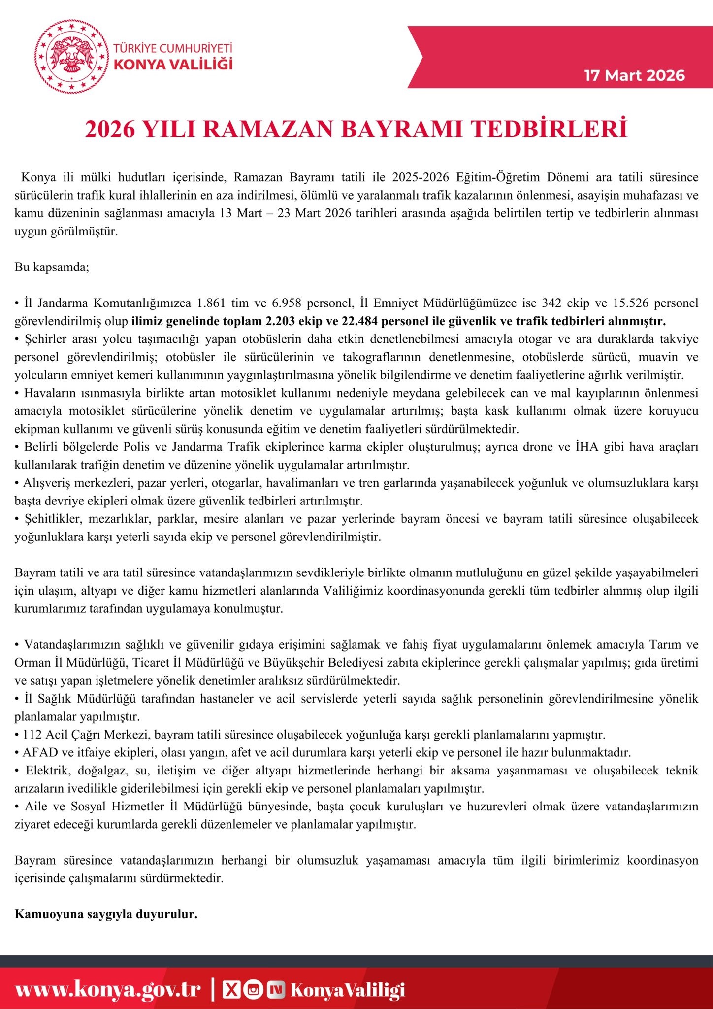 Konya Valiliği, Ramazan Bayramı ile 2025-2026 eğitim-öğretim yılı ara tatili süresince vatandaşların huzur ve güven içinde bayram geçirebilmesi amacıyla kapsamlı tedbirler aldı. 13 Mart – 23 Mart 2026 tarihleri arasında uygulanacak önlemler kapsamında özellikle trafik güvenliği, asayiş ve kamu düzeninin korunmasına yönelik denetimler artırıldı.
