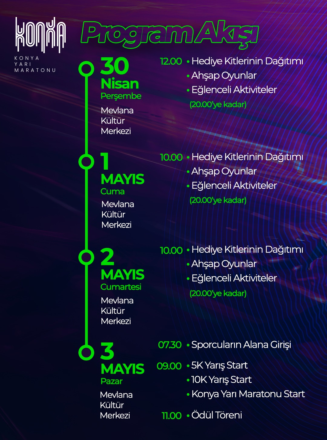 3 Mayıs 2026 tarihinde düzenlenecek olan "Konya Yarı Maratonu” kapsamında 5K parkur güzergâhı aşağıdaki şekilde planlanmıştır: